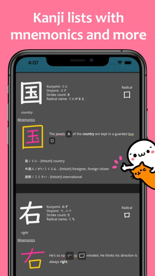 > Kanji: 12,000+ kanji, with no limits on what you can study! Over 2,000 colorful mnemonics help you to understand and retain the meanings.