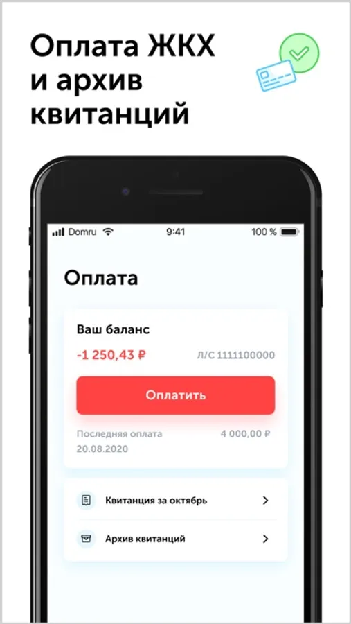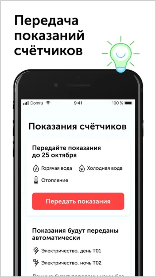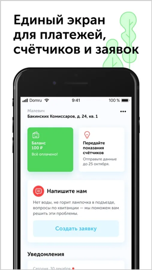 На одном экране отслеживать баланс лицевого счета, контролировать отправку показаний счетчиков и создавать заявки в сервисную компанию