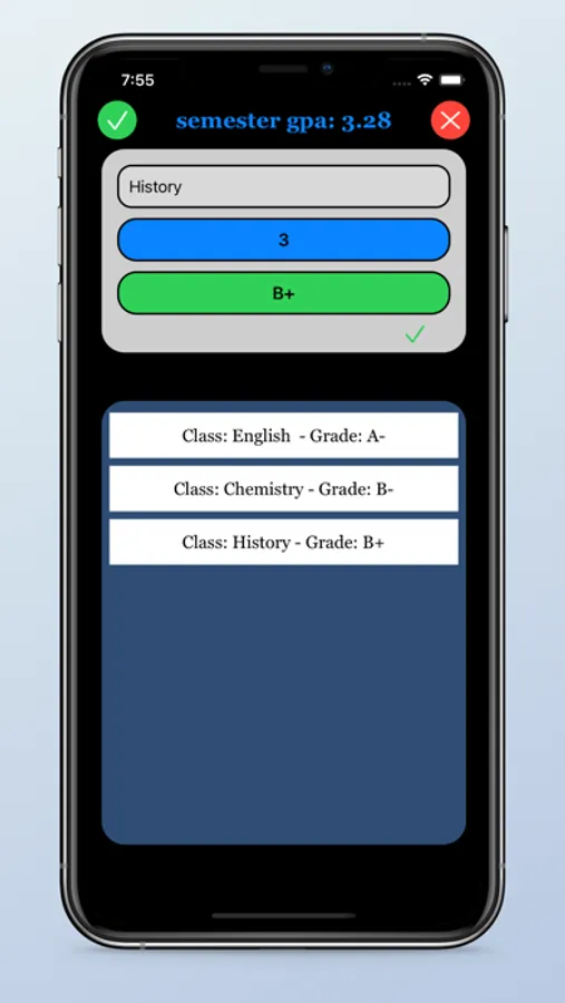 -Tap on the round green CHECKMARK button at the top to save all your classes as a semester.