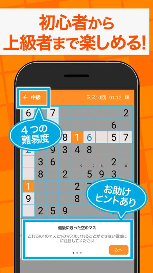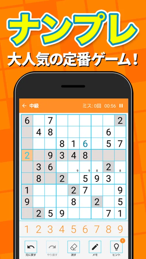 使い方も簡単、ヒント機能も便利、無料の人気ナンプレアプリを今スグ始めよう!