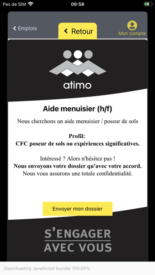 L'application Atimo vous permet de consulter les offres d'emploi et de mettre rapidement vos documents à disposition d'Atimo (CV, documents pour l'engagement, ...).