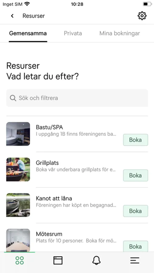 * Boka gemensamma resurser som exempelvis tvättstuga, utrymmen och verktyg. Du kan enkelt dela och byta saker och tjänster med dina grannar.