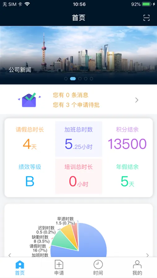 ·独立的5个功能页签,首页,团队,申请,时间,我的,完美了覆盖员工的所有的操作,并且提供的便捷的入口。