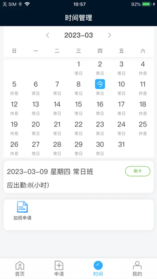 ·时间页签,按日统计了员工的日常考勤情况,并且可以进行一键的流程的申请和在线的刷卡。