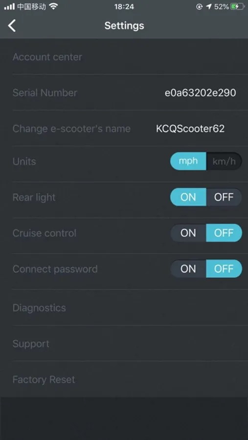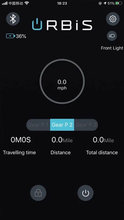 mobile phone and the device, you can see the vehicle's real-time speed, the mileage of a single run, the total mileage of the run, the switching status of the headlights, and whether the vehicle is locked on the main interface. On the Settings page, you can see,