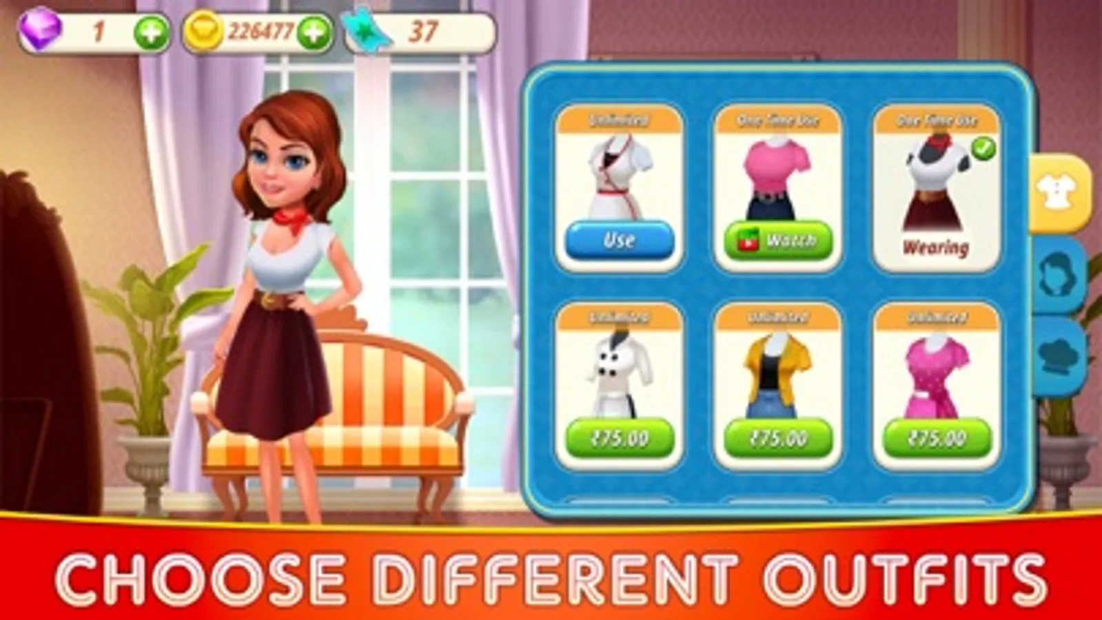 -Try out various elegant outfits while playing baking games.