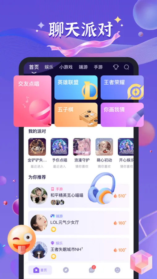 多样化的交友房间,连麦聊天、语音交友、在线点单、k歌点唱、相亲娱乐,超多可爱小姐姐给你比心~
