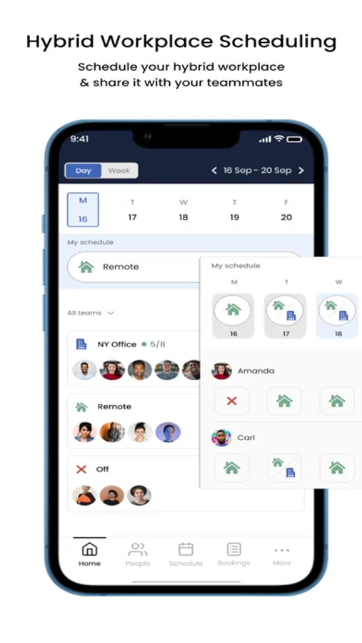 - Hybrid workplace schedule : plan your week of work in advance and share where you will be working from: the office, home, a coworking space or anywhere else. Also share your days off: sick leave, public holiday or annual leave.