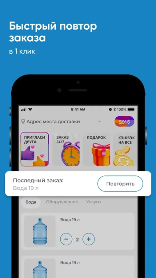Скачайте бесплатное приложение на телефон и заказывайте чистую воду в удобное время!