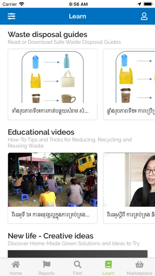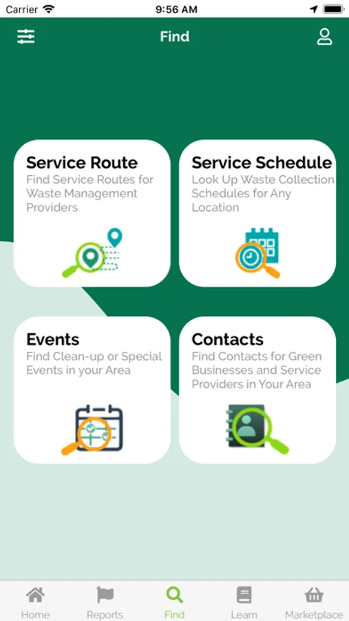 series of 4 comprehensive features (Report, Find, Learn & Marketplace) enable citizens to report waste issues and have