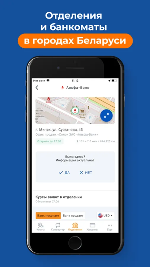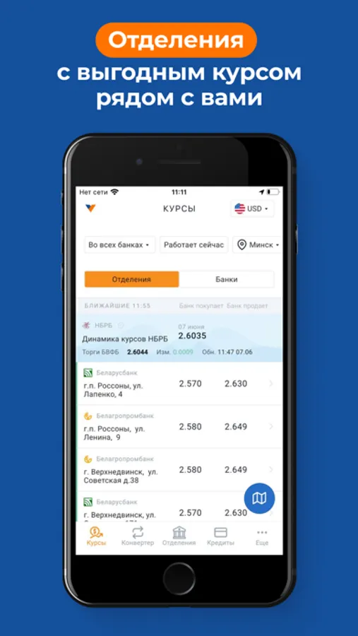 В приложении для каждого отделения вы найдете все услуги, актуальные телефоны, курсы валют, кросс-курсы и конвертер валют.