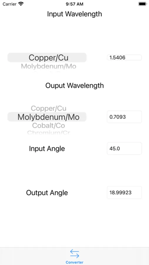Bragg's Law Angle Converter is a very clean, simple, and direct angle converter based around Bragg's Law. Utilize this lightweight utility app to quickly calculate output angles using varying common standard wavelengths. As well as the input angle, the values for the input wavelengths are able to be edited. Output angles are calculated in real time as typing. This app is also dark mode compatible