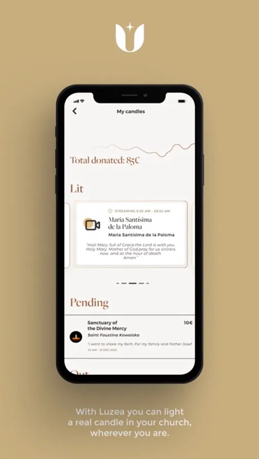 At Luzea™ we want all the faithful to be able to be present in their churches by lighting candles, and to be able to support the Church by sending donations. Luzea™ app allows you to light a real candle in a church and chapel of your choice, while sending a donation at the same time.