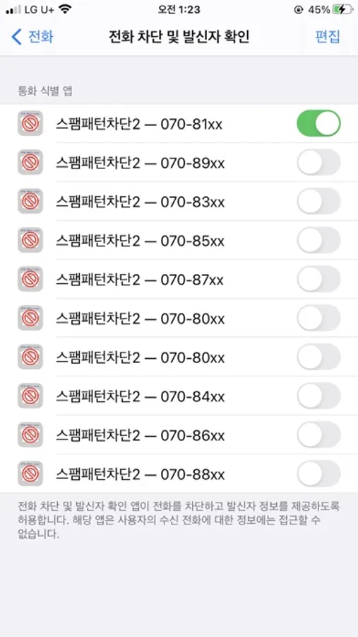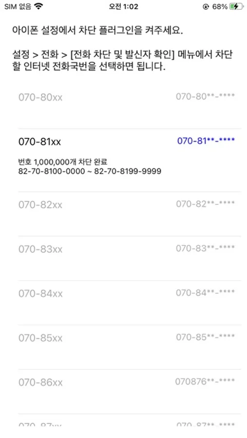 원하는 국번을 선택하여 스위치를 켜면 해당 국번에 속하는 모든 전화번호가 차단됩니다.