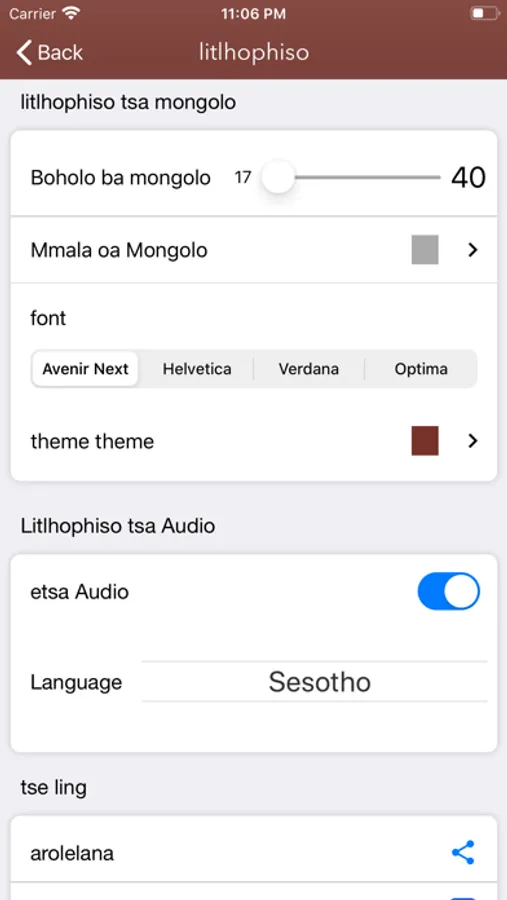 E kenyelletsa litlhophiso tsa boholo ba fonte, le molumo bakeng sa likhaolo tsohle tsa Bibele