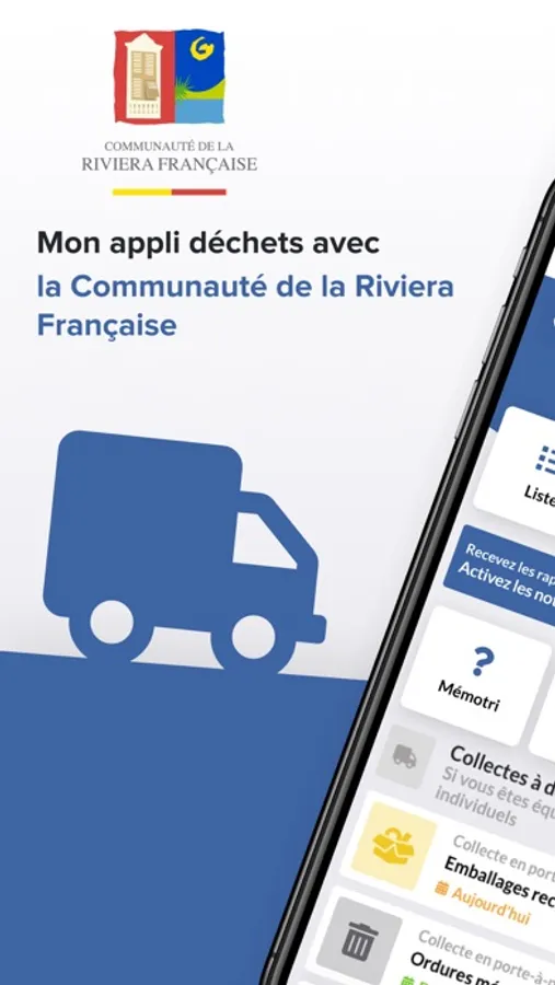 L’application Mes déchets - CARF est l’application officielle pour tout savoir sur la gestion de vos déchets ménagers sur la Communauté de la Riviera française. Elle recense toutes les informations utiles au tri et à la prévention de vos déchets, en fonction de votre adresse : planning personnalisé de collecte, position et disponibilité des points de collecte de proximité, horaires et informations pratiques sur les déchèteries, consignes de tri et bien plus encore.