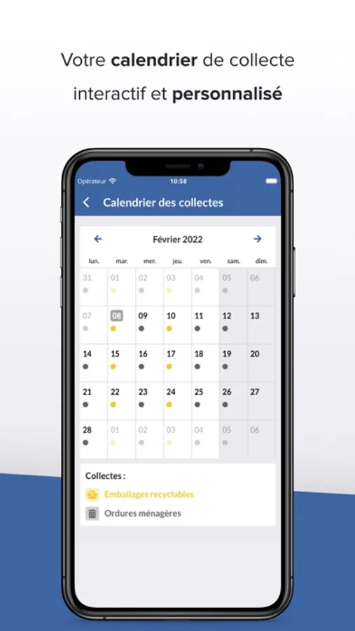 L’application vous donne automatiquement le jour du prochain passage du camion de collectes ou bien vous renseigne sur la localisation des points de collecte de proximité d’ordures ménagères, des emballages recyclables et du verre. Vous avez également accès au planning annuel des collectes, avec la prise en compte des jours fériés.