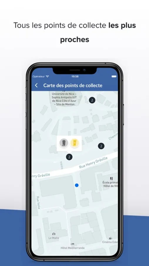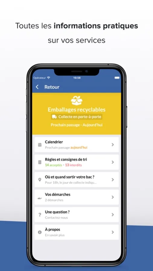 L’application recense les points de collecte les plus proches de vous grâce à la géolocalisation, et vous donne les règles et consignes de tri à respecter pour chaque service (le verre, les emballages recyclables, les cartons, les ordures ménagères, etc.). Vous n’aurez plus de doute sur les consignes de tri, la localisation d’un point de collecte ou sur les horaires d’ouverture des déchèteries : la bonne information est dans l’votre application !