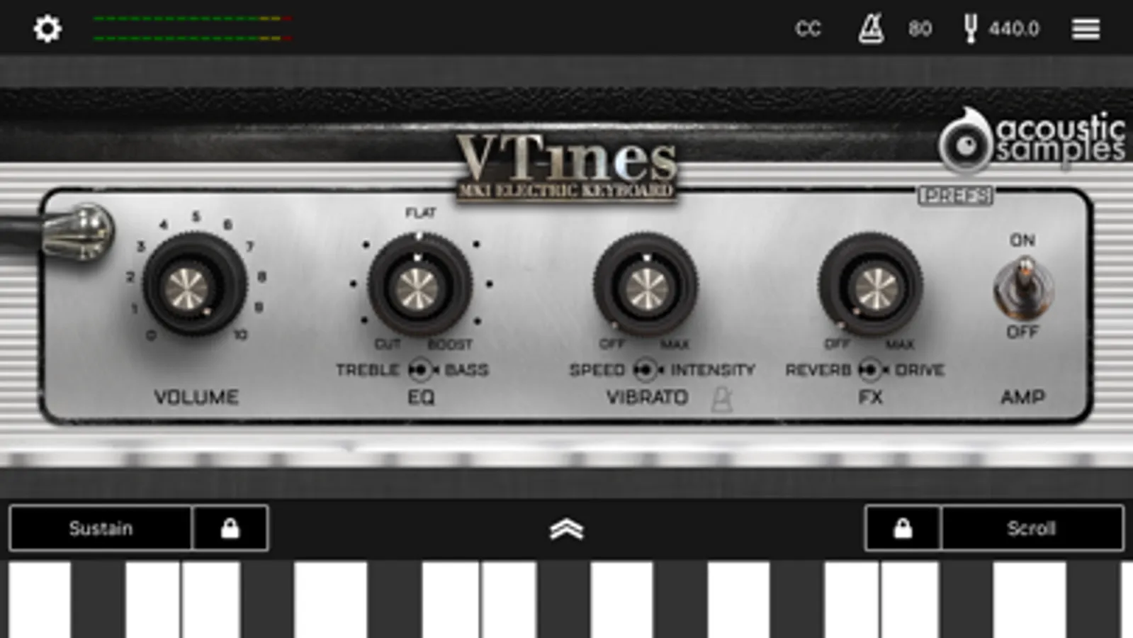 The VTines combines samples and modeling techniques to accurately reproduce the sound of the original instrument. This allows the VTines to weight only 90Mb, to really sound like a Fender Rhodes with all of its imperfections and to have a fully continuous response.