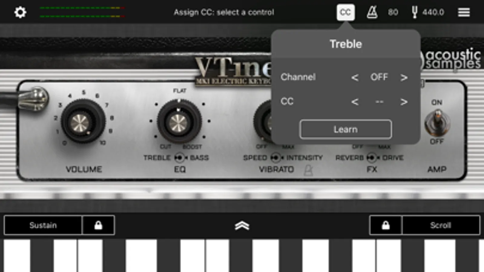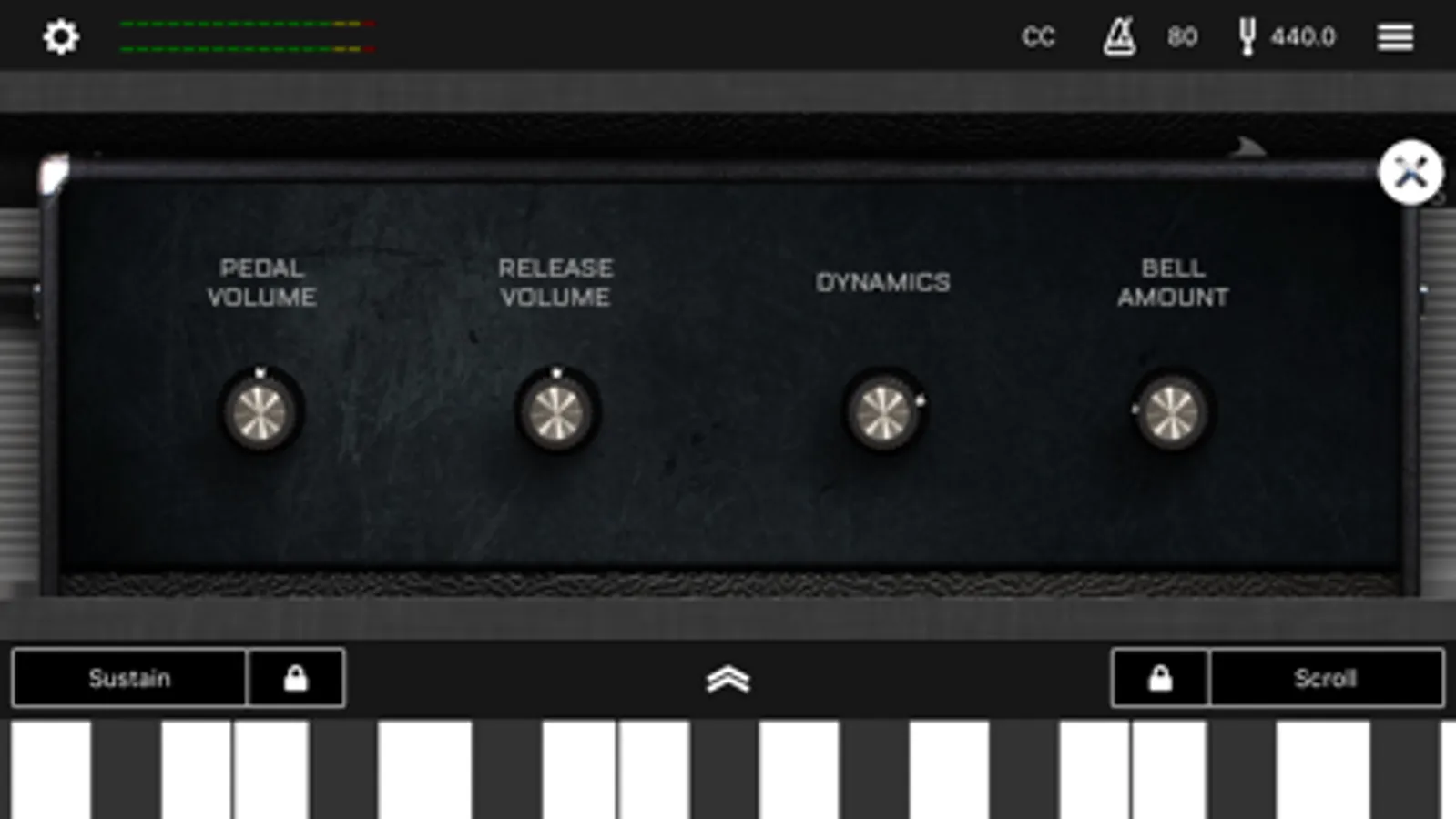The second concentric knobs control Treble and Bass, just like on a real suitcase Rhodes. We measured this carefully and made sure the ranges and frequencies matched the original.