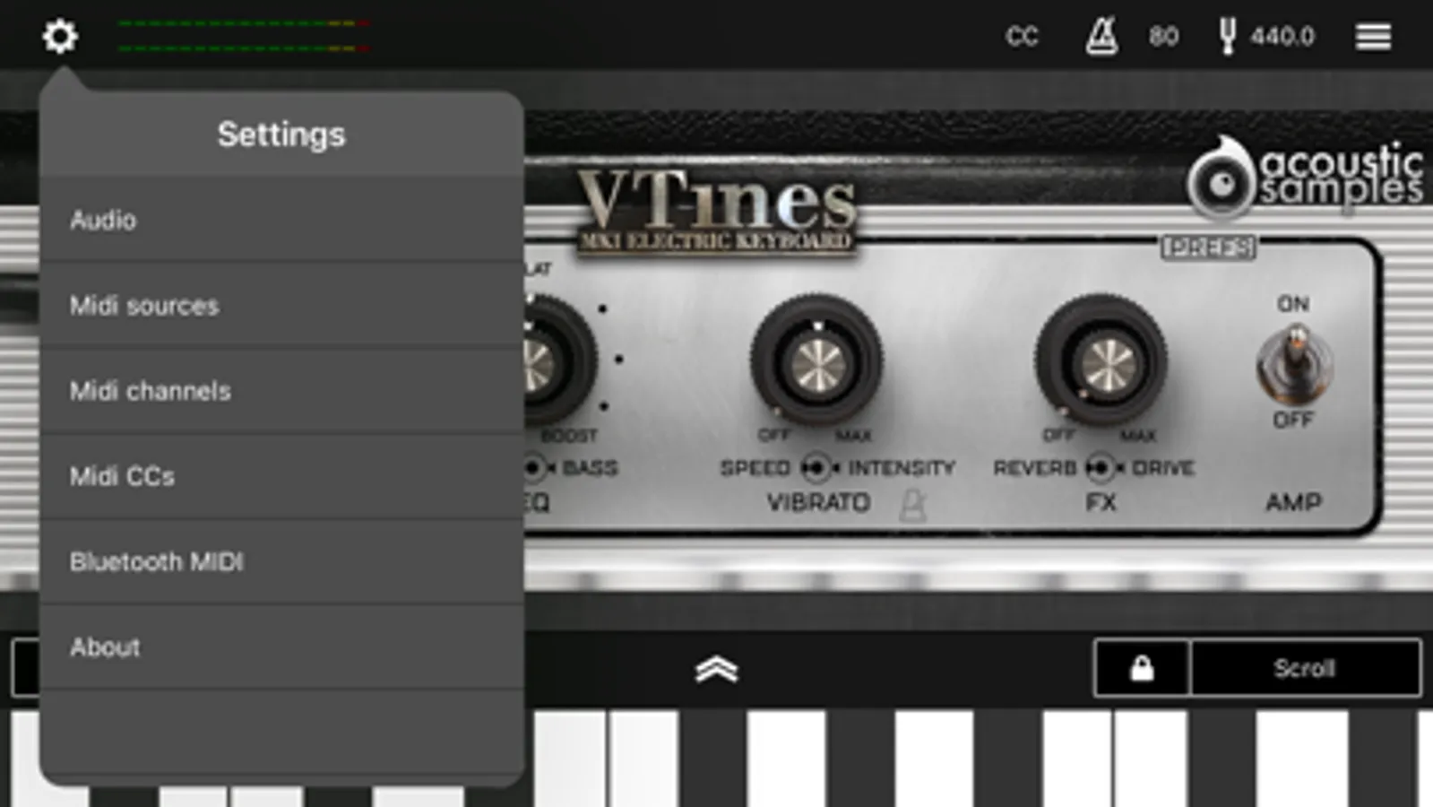 The VTines instrument is based on real samples of a 1978 Fender Rhodes© Mark1 fully restored with clean pickups and tines, new grommets, new hammer tips, etc, so it is the best an electric piano can sound. Our model gives you access to a 100% continuous response, a very small sized library (90Mb), common FX and adjustable bell and release volumes. It also ensures that the staccatos and releases that make up for half of the realism sound perfect, not like a fadeout, not too loud, just perfect.