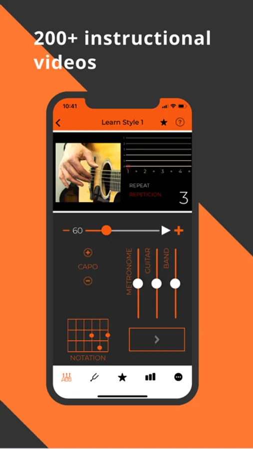 What's more, Learn Guitar App is fully bilingual. Language can be switched between English to Spanish at anytime in any section. All texts and videos are displayed and spoken in the language of choice. Learn Guitar App comes with 200+ practice examples. New content is added with every update.