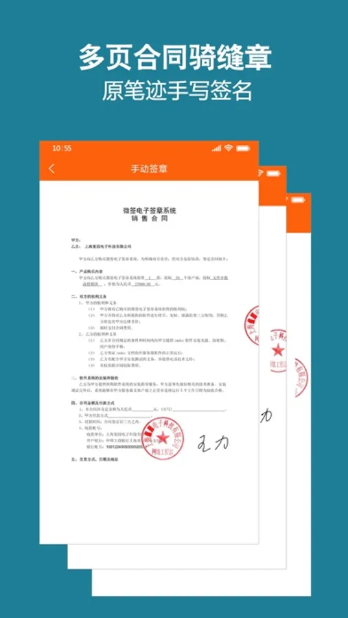 PC、APP、小程序上,随时在合同文件上加盖电子印章、骑缝章、电子签名。