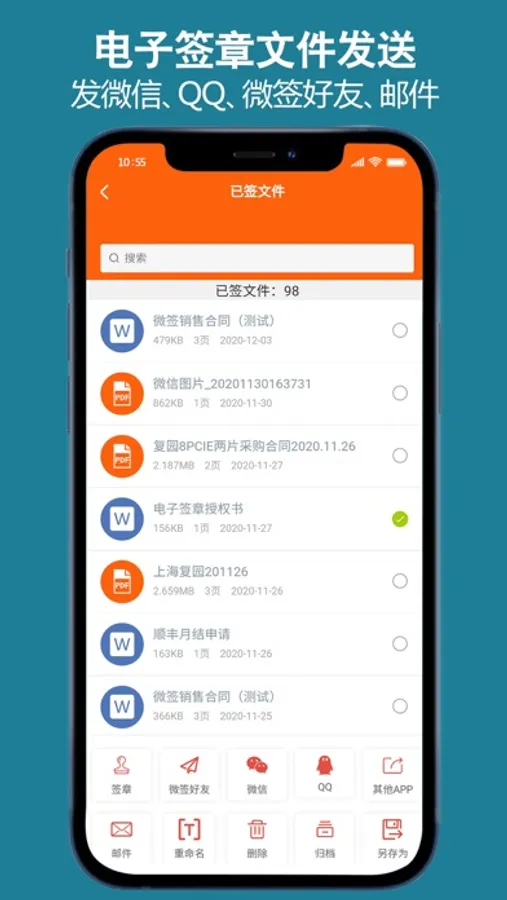 已签章的文件,可通过微信、QQ、微签好友、邮件、下载等多种方式,一键发送给客户。
