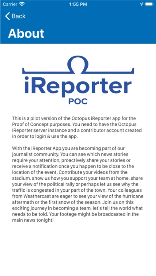 This is a pilot version of the Octopus iReporter app for the Proof of Concept purposes. You need to have the Octopus iReporter server instance and a contributor account created in order to login & use the app.nnWith the iReporter App you are becoming part of our journalist community. You can see which news stories require your attention, proactively share your stories or receive a notification once you happen to be close to the location of the event. Contribute your videos from the stadium, show us how you support your team at home, share your view of the political rally or perhaps let us see why the traffic is congested in your part of the town. Your colleagues from Weathercast are eager to see your view of the hurricane aftermath or the first snow of the season. Join us on this exciting journey in becoming a team, let's tell the world what needs to be told. Your footage might be broadcasted in the main news tonight!n