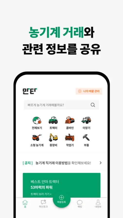 농기계 거래 플랫폼 “만타“는 중고/ 신품농기계 거래 및 광고가 가능 하도록