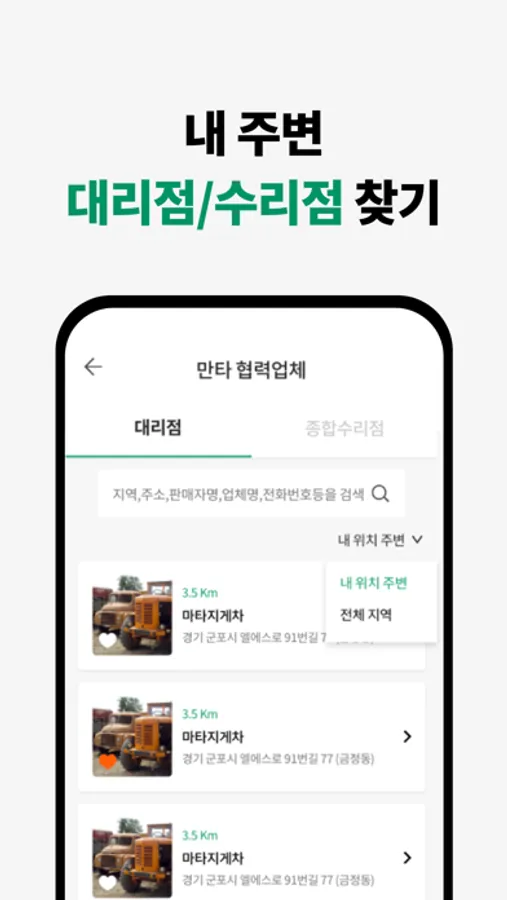 GPS기반 지역 업체 ( 대리점/ 수리점 ) 매물 정보 및 위치를 제공합니다.