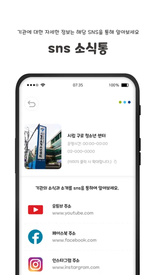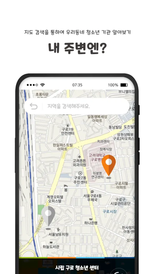 지도 검색을 통해 내 주변 청소년 기관을 찾고, 기관 SNS링크를 통해 쉽게, 자세히 알아 볼 수 있어요