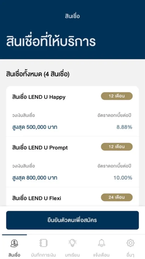 แอปพลิเคชั่นสำหรับสมัครสินเชื่อสวัสดิการผ่านระบบออนไลน์ที่ครบถ้วนในที่เดียว ทั้งการยืนยันตัวตน การสมัครสินเชื่อ และการตรวจสอบข้อมูลสินเชื่อไม่ว่าจะเป็นเงินต้นคงเหลือ จำนวนงวดที่ผ่อนชำระไปแล้ว ยอดชำระต่อเดือน หรือวันที่ครบกำหนดชำระ อีกทั้งยังมีเมนู “บันทึกการเงิน” เพื่อควบคุมและติดตามค่าใช้จ่ายของคุณ รวมถึงคำแนะนำในการบริหารจัดการเงินอย่างมีคุณภาพด้วยเมนู “บทเรียน” ที่จะเป็นตัวช่วยในการให้ความรู้ด้านการเงิน การบริหารจัดการหนี้และการลงทุน