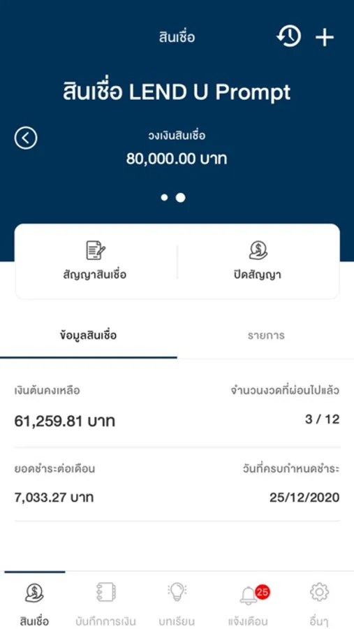 - 25 ก.ย. 65 ยอดชำระ=1,805.17 บาท (เงินต้น=1,782.88 บาท ,ดอกเบี้ยสะสม 31 วัน=1,782.88 *15%*31/365=22.29บาท) เหลือเงินต้นคงค้าง=0.00 บาท