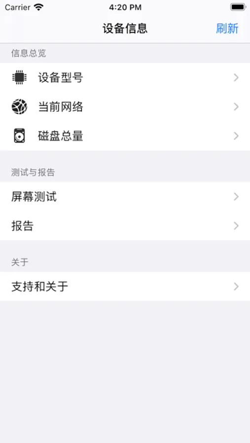 获取的iPhone数据包括硬件信息、网络信息和存储信息。测试iPhone屏幕只测试显色功能,生成的iPhone信息报告可复制到剪贴板中。
