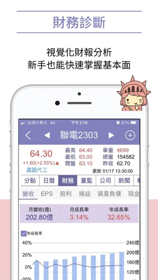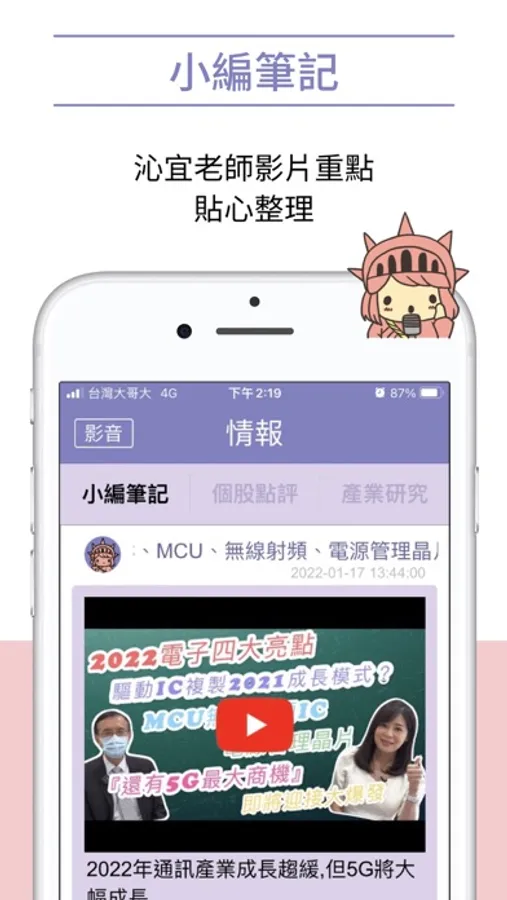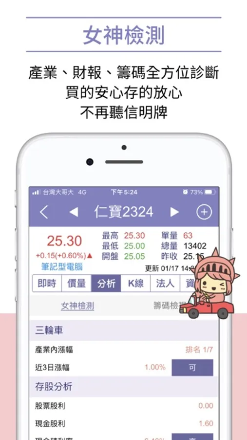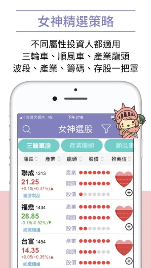 「台股自由女神」APP 將沁宜的理財邏輯AI化,透過「財經宜」投資心法、AI智慧科技、即時股市資訊、選股邏輯分析,提高投資「效率」及「勝率」!