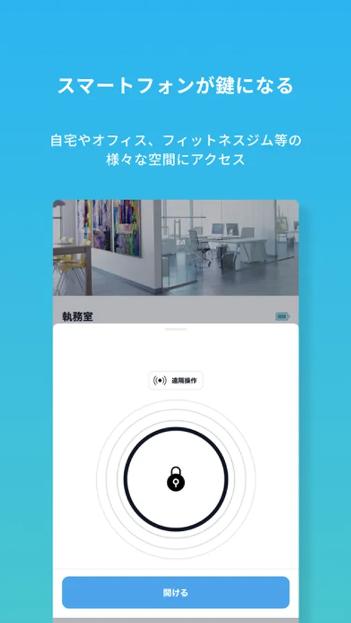 アプリでドアの鍵を開けることができます。Akerunアカウントで合鍵を受け取ることで、アクセスできる空間を増やすことができます。様々な電気錠や自動ドア、ゲートに対応しています。