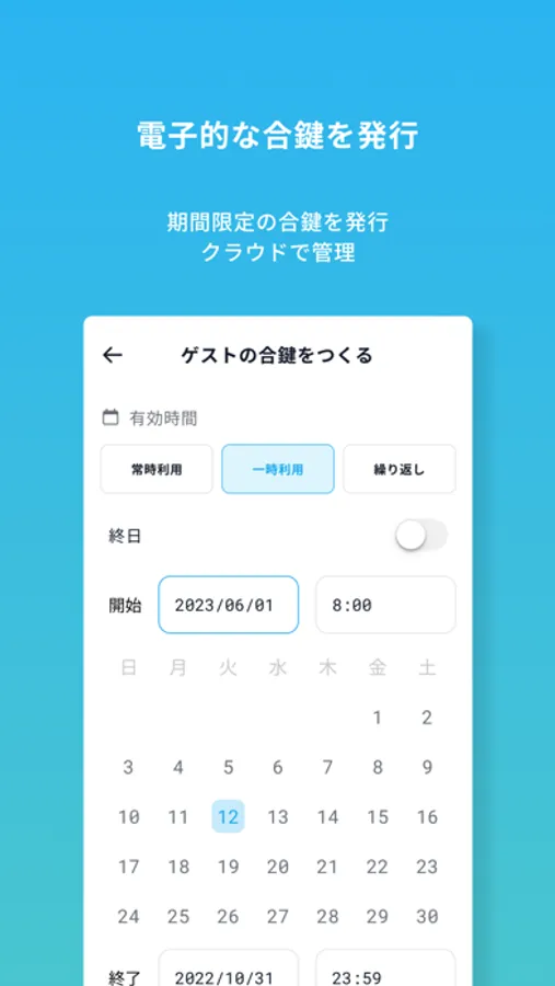 スマートフォンで電子的な合鍵をつくり、すぐに送ることができます。また、合鍵には有効期限を設定することもできます。