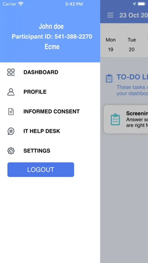 • Subjects create a ClaimIt Global account and complete the Informed Consent process. A series of screens explains the parameters of the study, including: