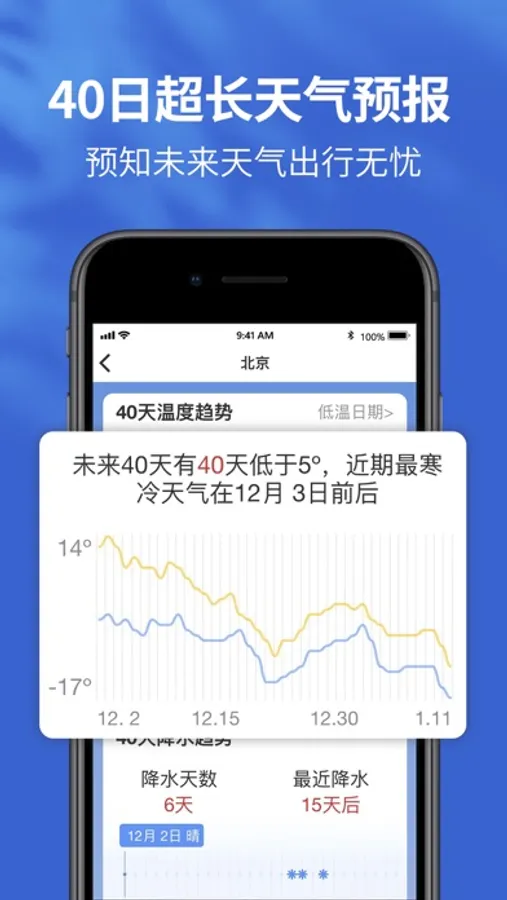 * 40日天气预报:40日超长天气预报,提供未来40天的降温、高温、低温提醒,预知未来天气出行无忧。