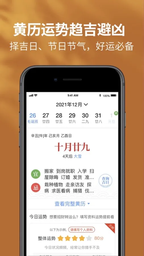 *黄历:完美传承中国传统文化,拥有完整的农历老黄历信息,提供黄历宜忌、黄道吉日、运势等查询功能,帮您轻松掌握所需信息。
