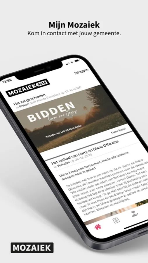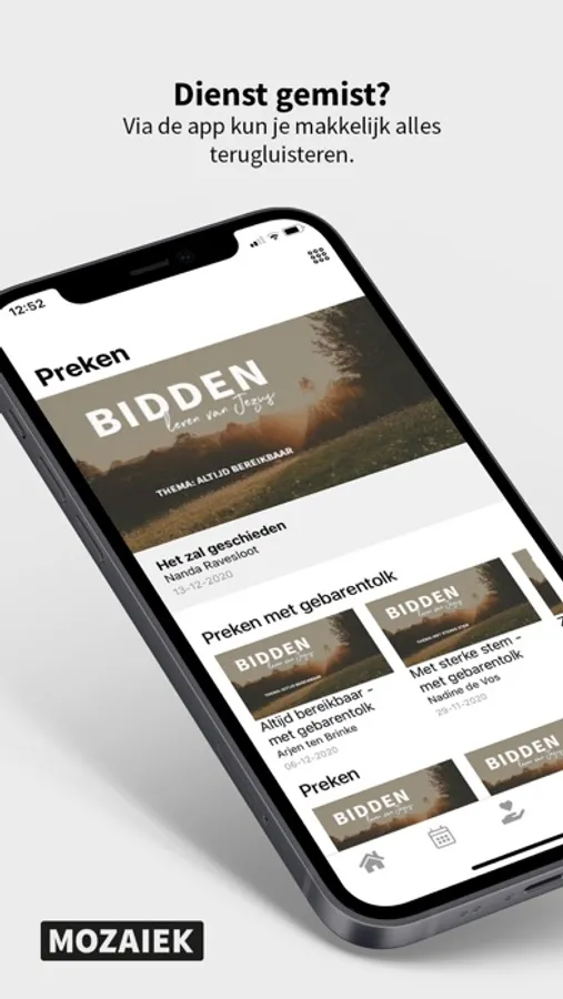 Met deze app sta je direct, veilig en besloten in verbinding met jouw Mozaiek gemeente. Je kunt er onder andere informatie vinden, preken terugluisteren en contact leggen met jouw gemeente. Maak je deel uit van een team? Dan kun je in de app ook jouw roosters vinden of je beschikbaarheid aangeven.