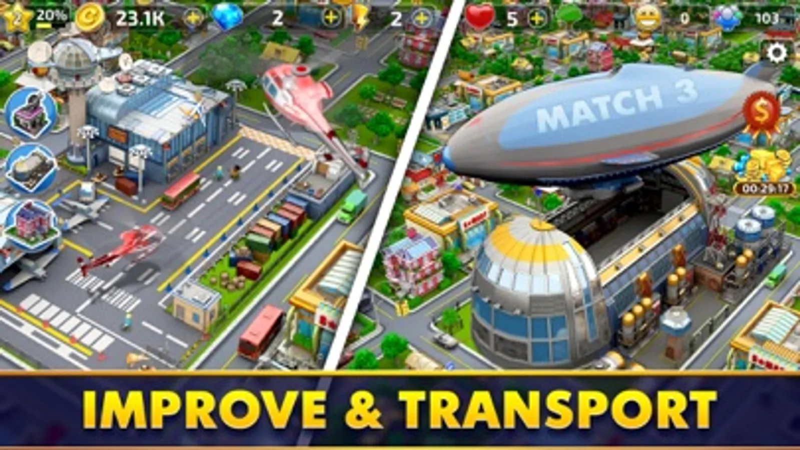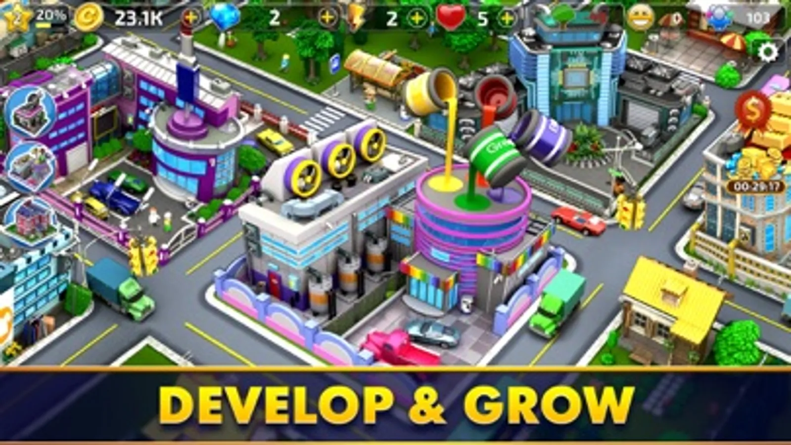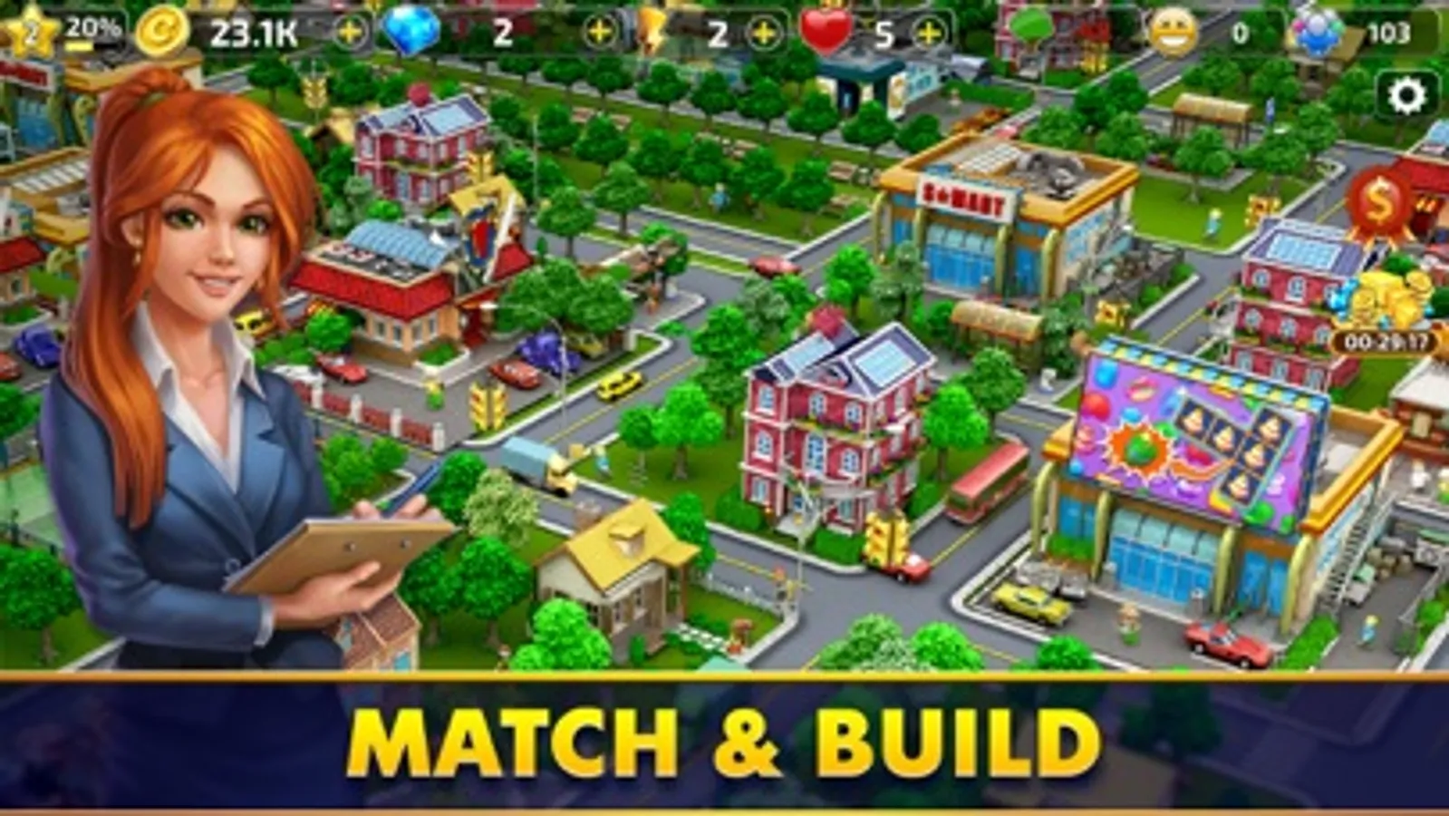 Play through dynamic match-3 levels, get energy and start to construct a city on an empty parcel of land. Expand your offerings step by step and transform your first development of several houses into a full-fledged city with dwellings, urban farms, industrial buildings, shopping malls, parks and more.