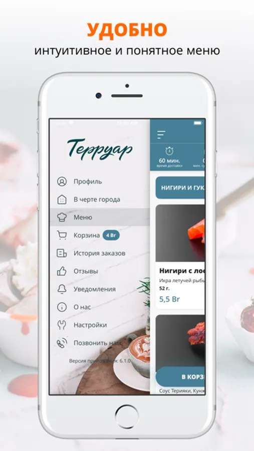 В этом приложении вы сможете заказать доставку из Терруара или оформить предзаказ навынос.