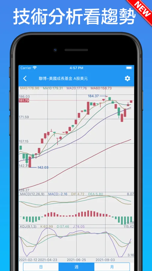 2.獨家提供多種技術指標(均線、(週/月)K線、(日/週/月)收盤線、布林通道、KDJ、RSI、MACD...等)方便判斷趨勢