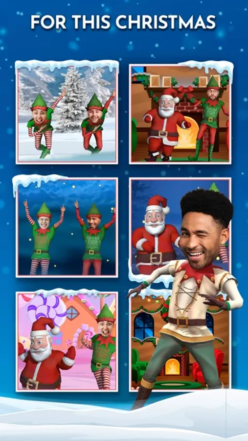 Select the best dance theme and get ready to do the traditional elf dance with Santa Claus or the Elves. Bring joy and live the Christmas spirit. Put your face on a 3D model. Place it onto the elf or Santa Claus. Discover various funny dances. Select between 10 original backgrounds. Record your character dancing and share it.