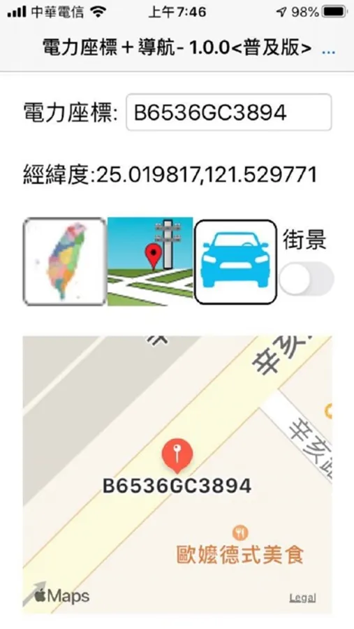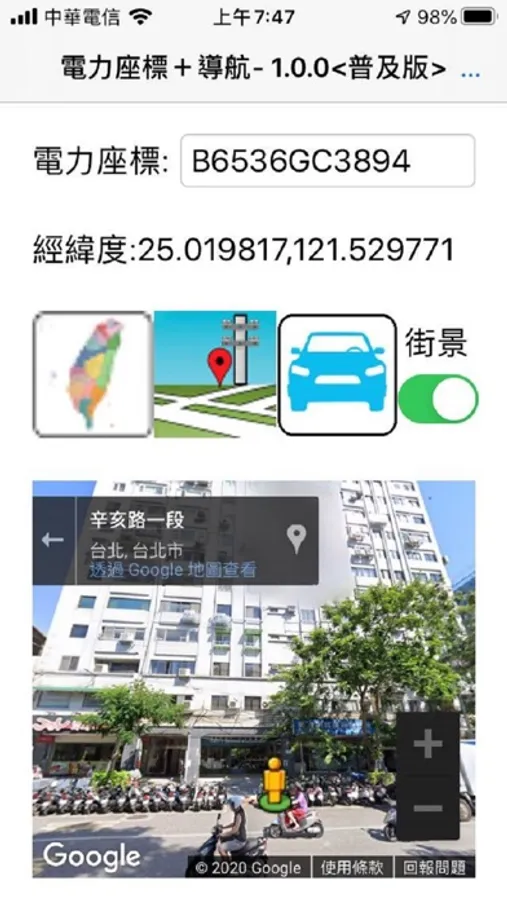本App可輸入【電力座標】後,在地圖上顯示並可切換成街景。