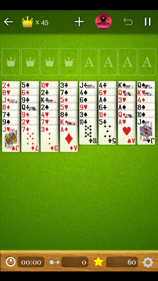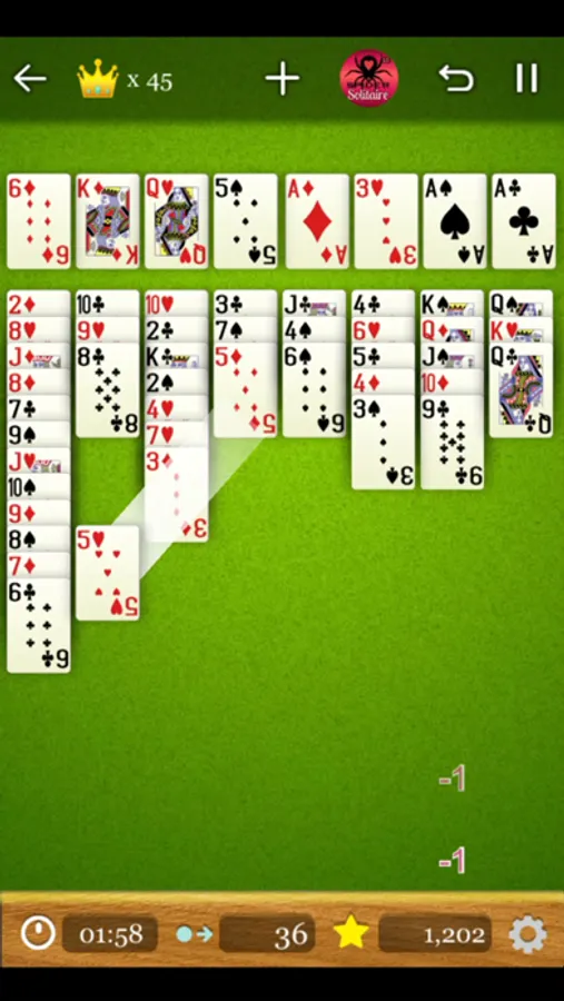 Card can be placed in descending order from bottom to top, Ace(1) to K(13), with the same suit in a column. For example, if you placed an Ace heart card to a foundation column, only heart cards can be placed on top of it.