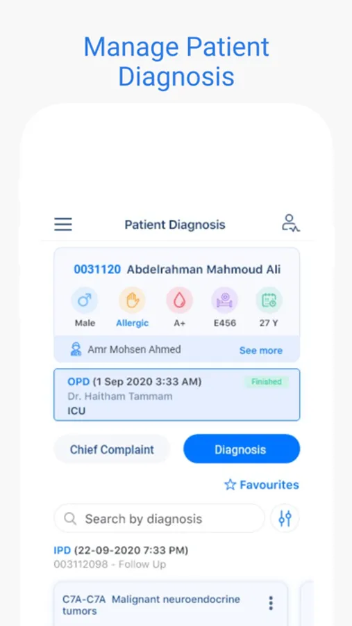 o Viewing the assigned patients lists (OPD-IPD-ER) to the physician according to the assignation, with the ability to search and filter the results.