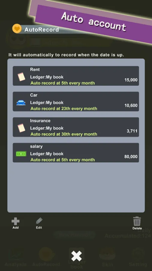 You can set a fixed monthly expenditure, and it will be automatically record when the time is up